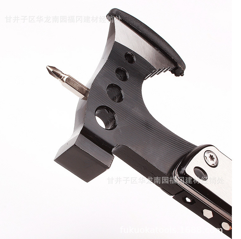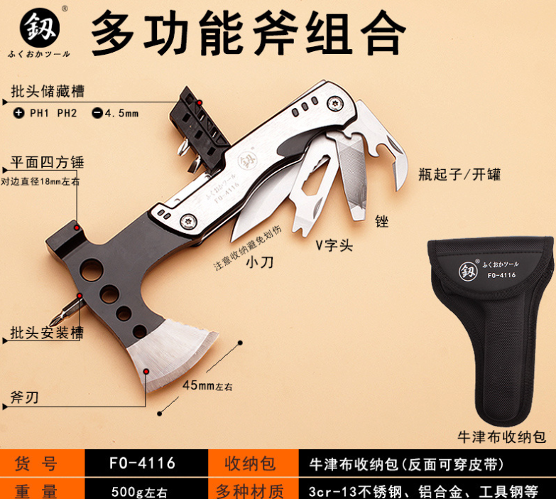 Thông tin chi tiết sản phẩm Thương hiệu: Fukuoka Tools Kích thước: 170 x 90 x 20mm (gấp lại), 250 x 90 x20mm (mở ra) Chất liệu: hợp kim nhôm thép không gỉ 3CR13 Mô tả chức năng : 1. Dao 2. Dụng cụ khui chai 3. Đồ khui 4. Máy khử cặn 5. Búa 6. Rìu 7. Tua vít bit x 3 8. Tệp 9. Nắp bảo quản bằng vải Oxford